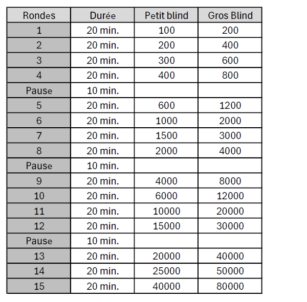 L’inscription est au coût de $50.00 on vous remettra 25000 en jetons, vous pouvez vous racheter autant de fois que vous désirez avant la première pause, et ce pour le même montant $50.00 pour 25000 en jetons. À la pause, un ajout (addon) est disponible au coût de $20.00 pour un jeton de10000.
